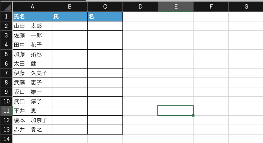 以下のような表があります。氏名の列には「氏」「スペース」「名」と入力されています。最初にフラッシュフィルを用いて、「氏」を入力させます。