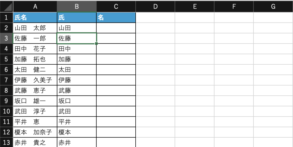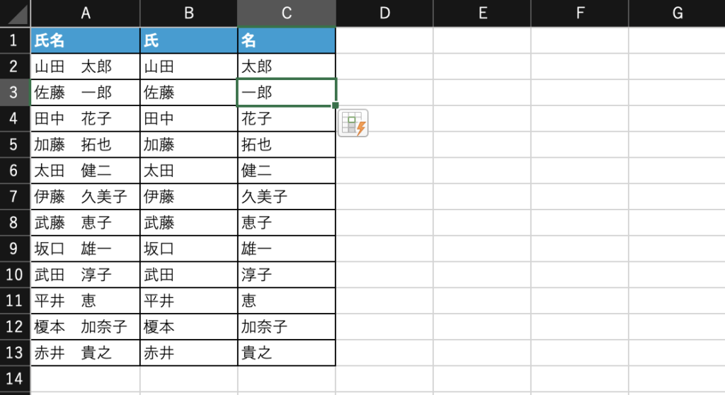 フラッシュフィルは、法則性を検知させデータを自動的に入力させる機能です。例えば、1つのセルに氏名が入力されており、それを「氏」と「名」に分けてセルに表示させるときに使用します。