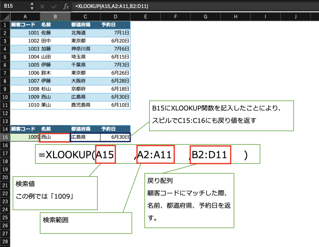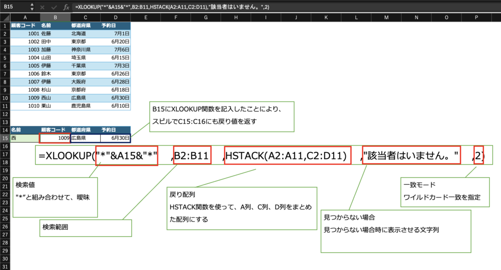 次は、ワイルドカードによる曖昧検索と、連続していない配列から複数のデータを返す例です。戻り値として返したい列「顧客コード」、「都道府県」、「予約日」は連続していない列であるため、HSTACK関数を使って、ひとつの配列としています。
