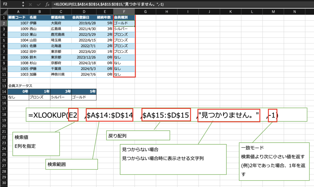 | [見つからない場合] | 有効な一致が見つからない場合は、 [見つからない場合] テキストを返す ※指定しなかった場合、#N/Aを返す |