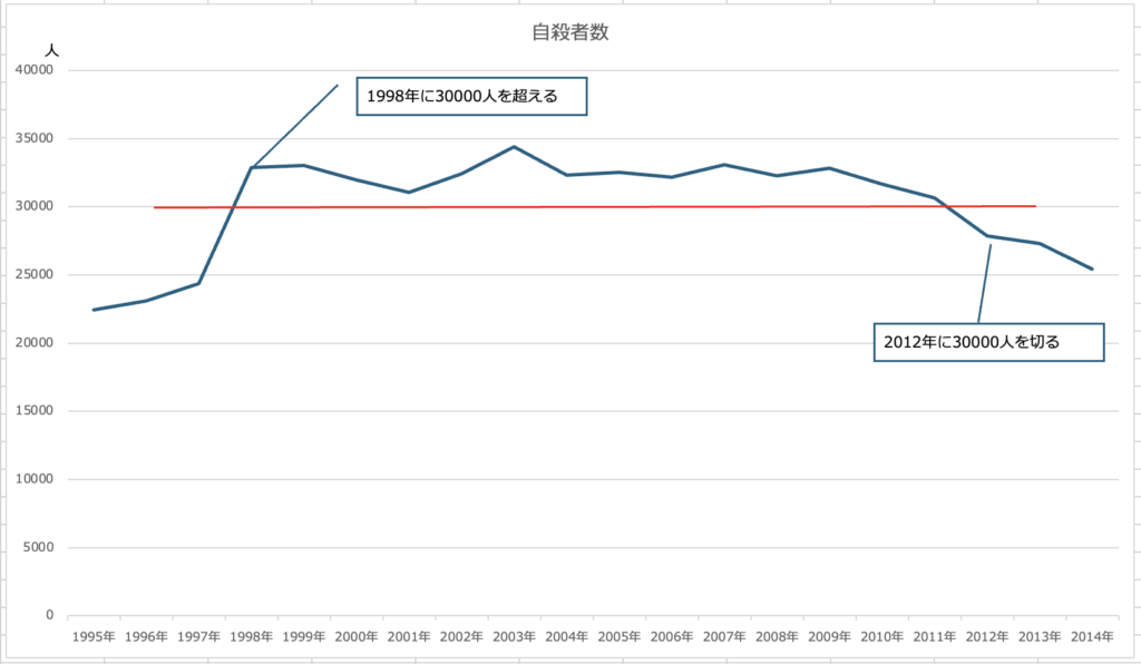 日本における自殺者数は、1998年に30,000人を超え2011年に至るまで、14年連続で30,000人を超えた。